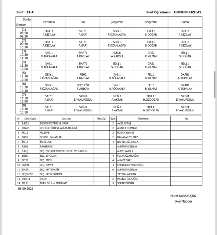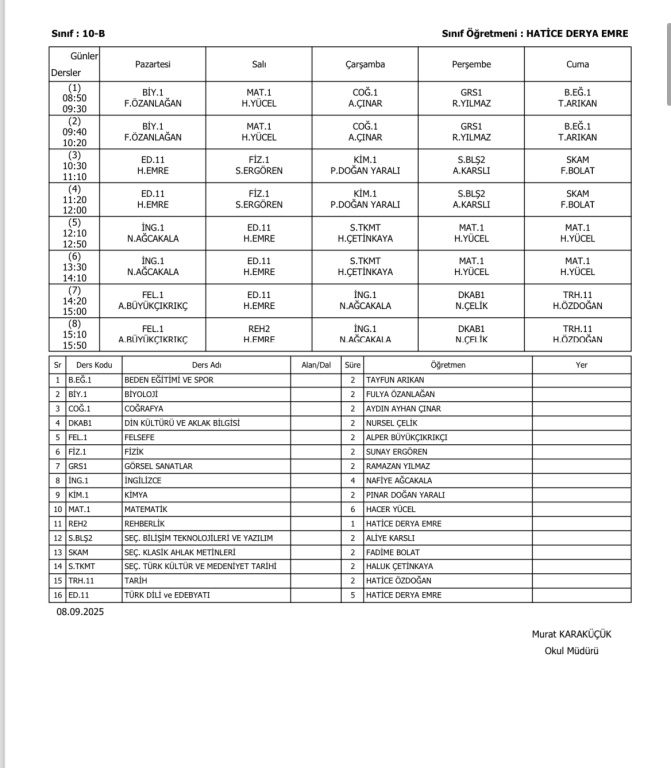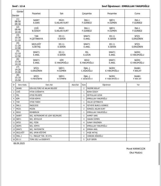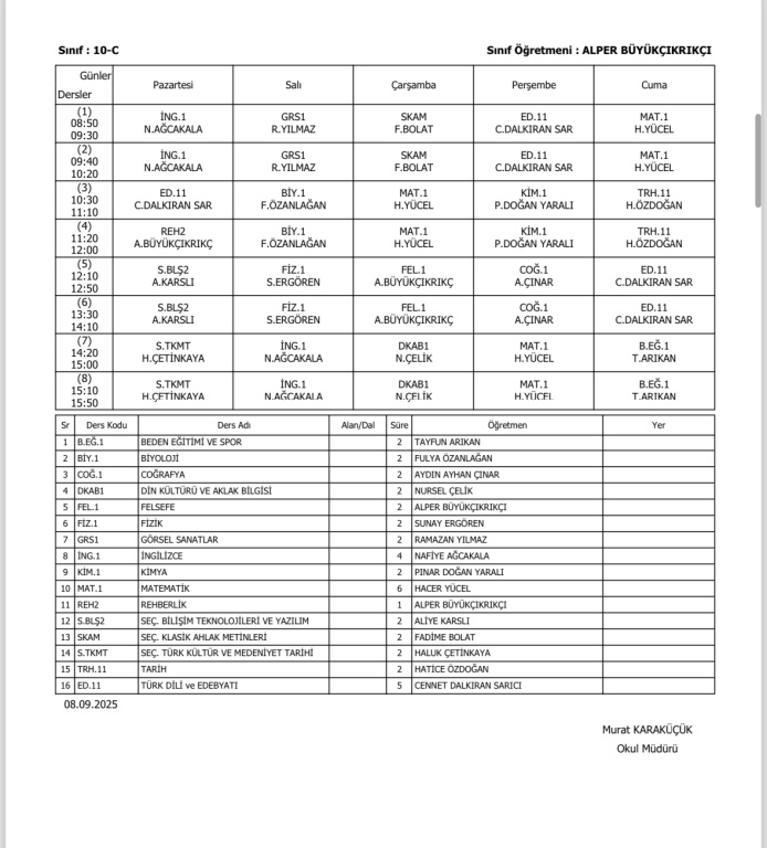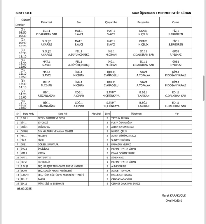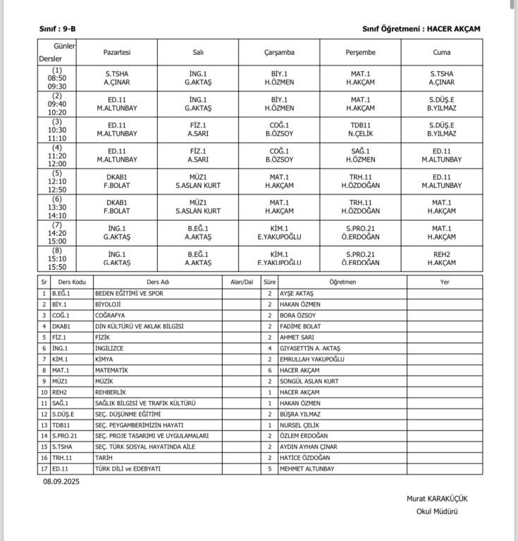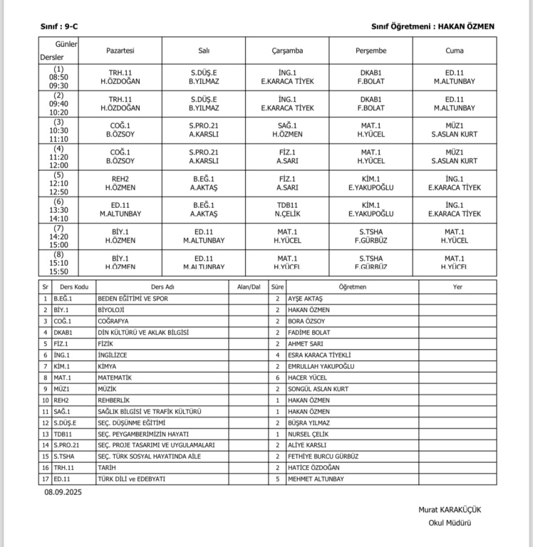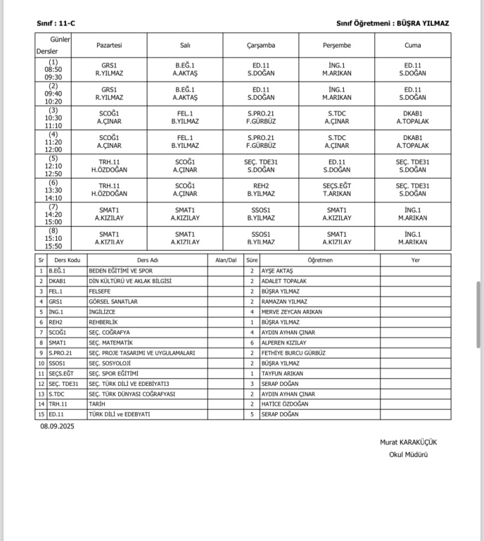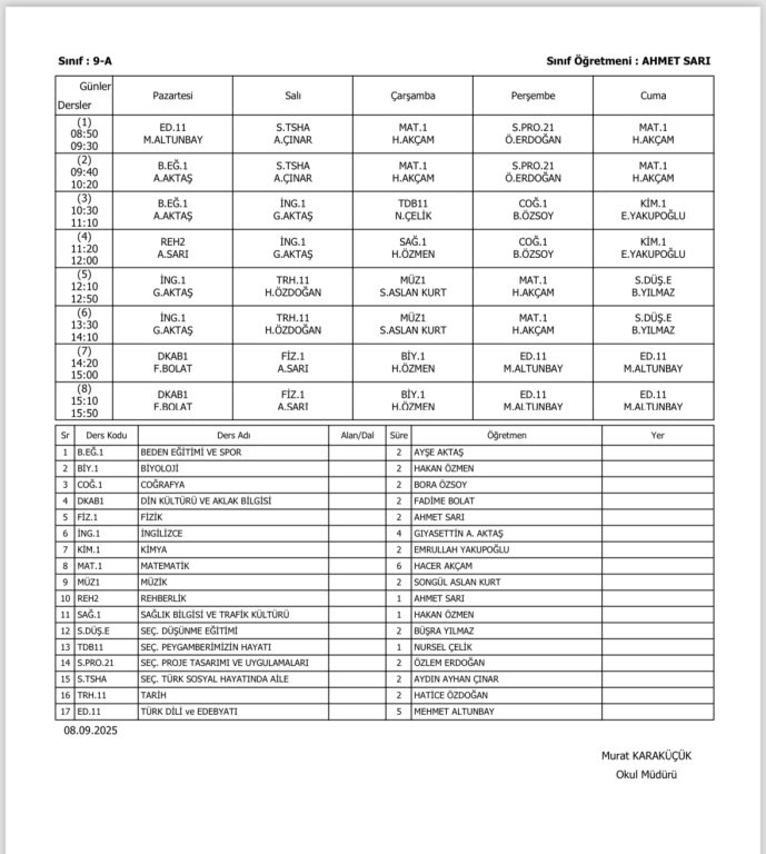Sınıfların Haftalık Ders Programı