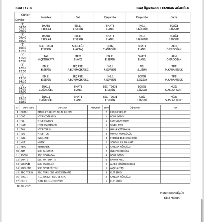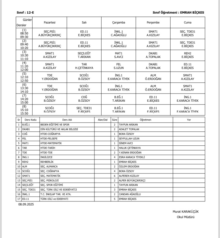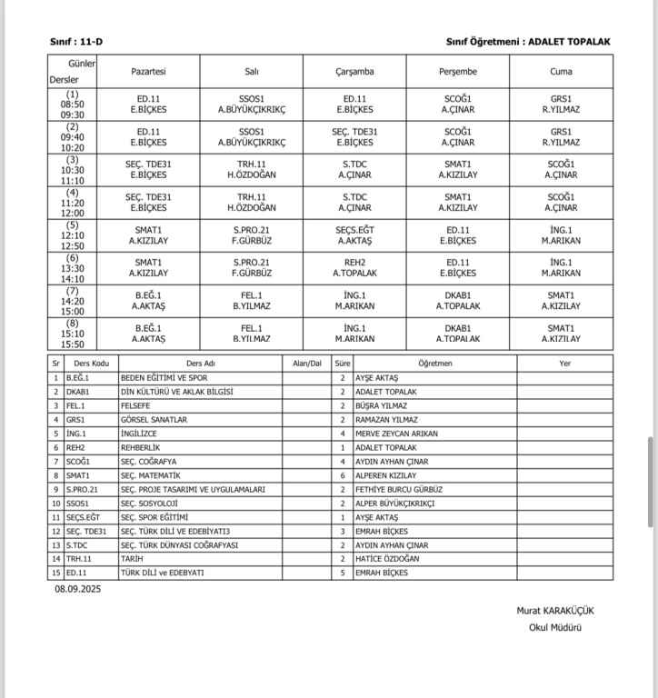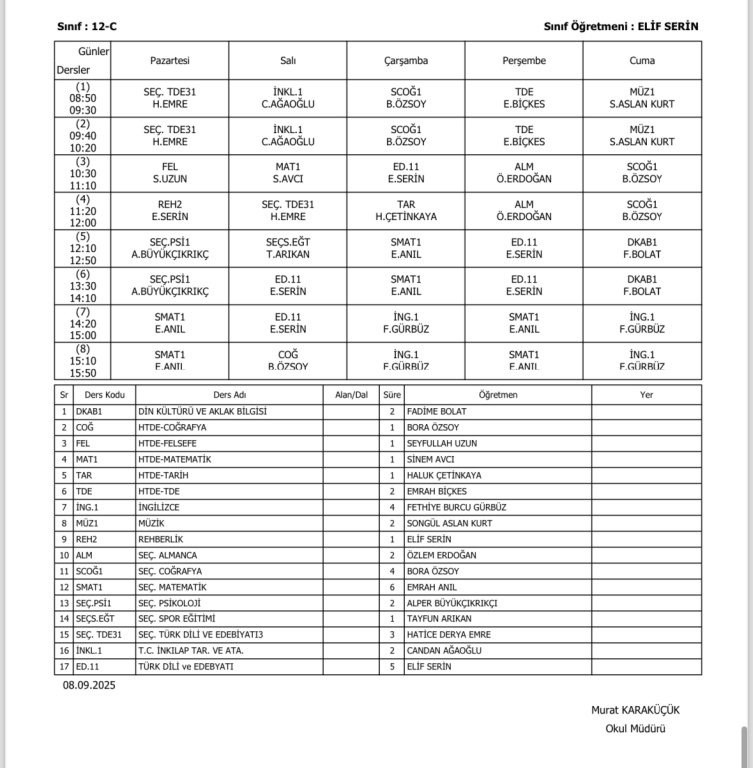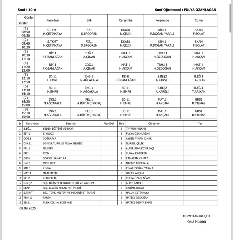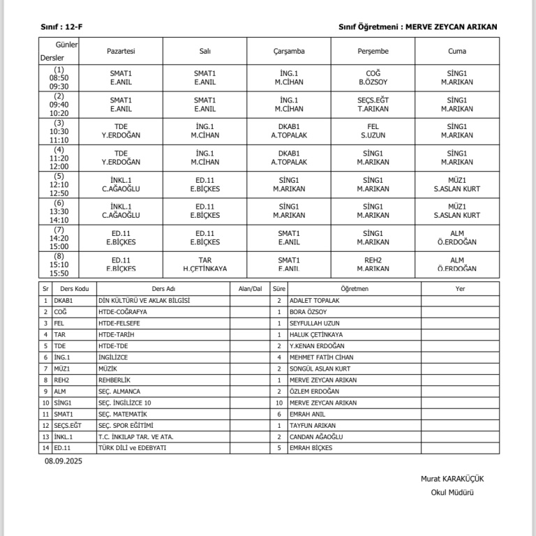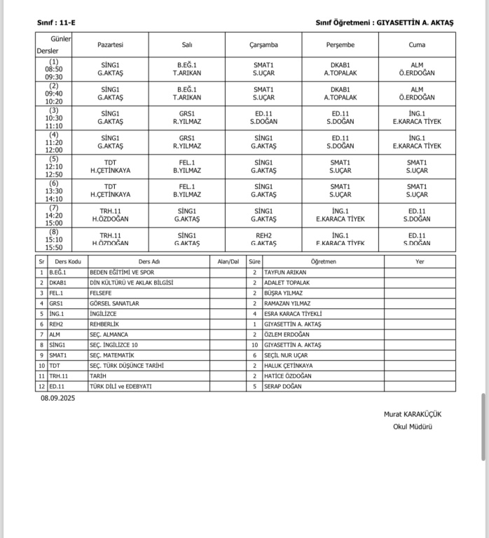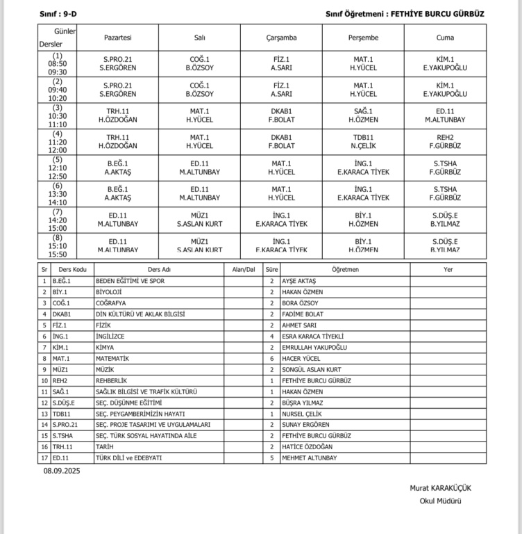 Sınıfların Haftalık Ders Programı
